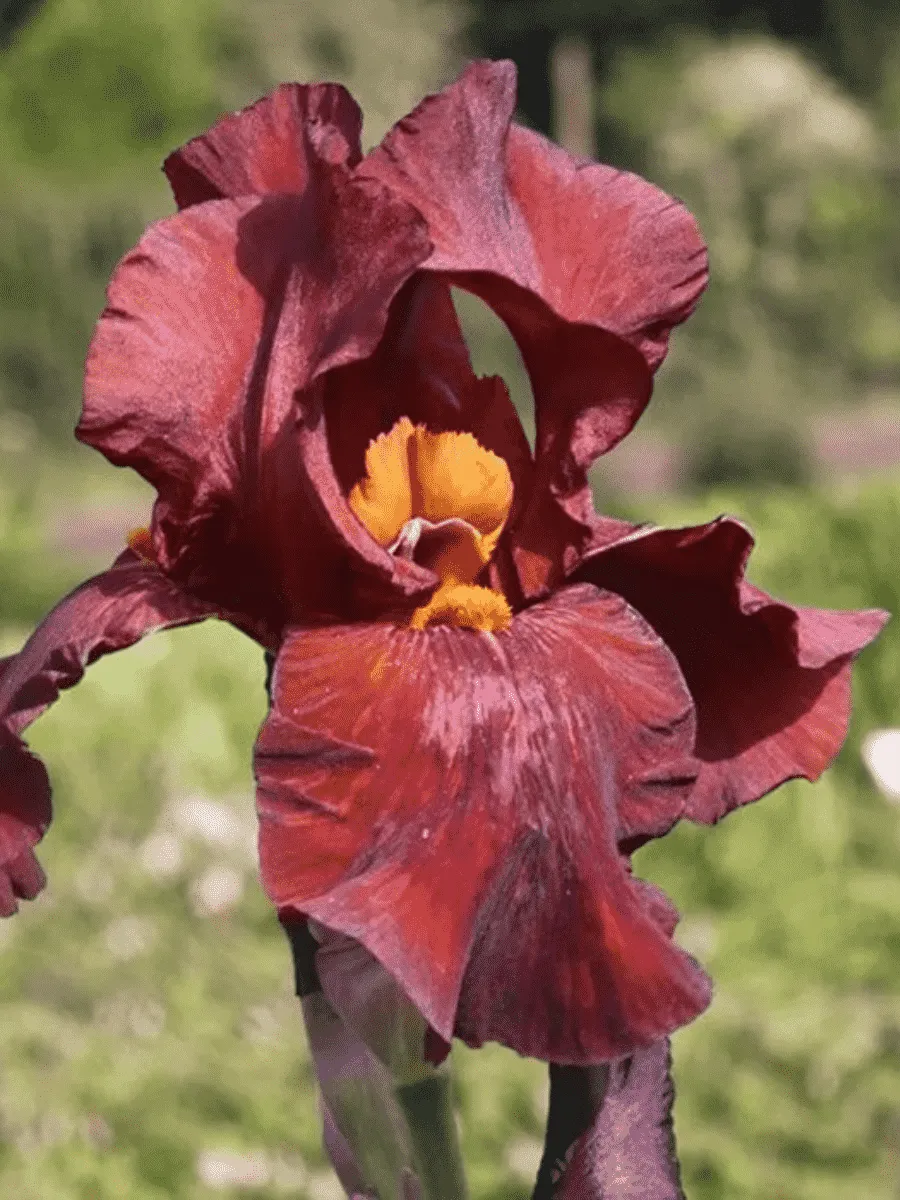 Ирис германский сорта *Respectable* пленяет взор благородством форм и изысканной цветовой гаммой. Его мощные корневища укореняются глубоко в почве, обеспечивая устойчивость и долговечность. Листья длинные, мечевидные, насыщенно-зелёного цвета, слегка блестящие, словно отполированные до зеркального блеска, образуют пышную розетку, подчёркивая величественную осанку цветка. Цветки крупные, диаметром около 15 см, распускаются в конце мая—начале июня, очаровывая нежностью оттенков от светло-фиолетового до глубокого синего с едва заметной серебристо-белой каймой по краям лепестков. Верхние доли венчика приподняты вверх, будто приветствуя солнце, нижние же элегантно свисают, придавая растению особую грациозность. Высота взрослого экземпляра достигает 80–90 см, благодаря чему сорт прекрасно смотрится в групповых посадках и миксбордерах, украшая сады и парки своей утончённой красотой.