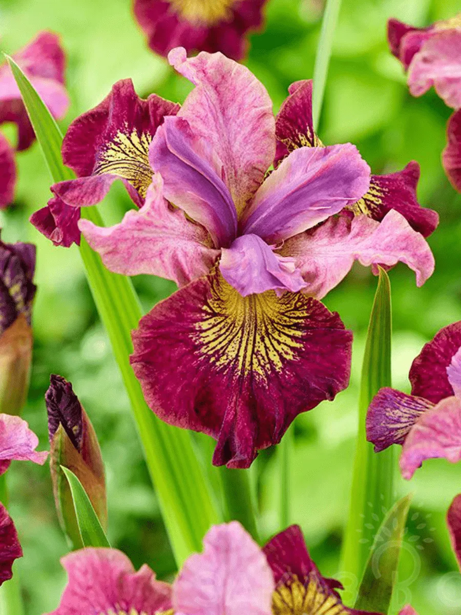 Ирис сибирский сорта *Miss Apple* пленяет своей утончённой красотой и благородством форм. Это многолетнее травянистое растение отличается стройностью облика и элегантной простотой линий. Листья узколинейные, ярко-зелёные, слегка блестящие, словно покрытые тонким слоем воскового блеска, устремлены вверх, создавая впечатление лёгкости и воздушности. Цветоносы высокие, прочные, несут крупные цветки нежнейшего розово-сиреневого оттенка с едва уловимым кремовым отливом, украшенные тонкими золотистыми прожилками, придающими особую изысканность. Лепестки цветка бархатистые, мягкие, будто сотканные из утреннего тумана, раскрываются постепенно, демонстрируя всю свою прелесть и очарование. Период цветения продолжительный, начинается в конце весны и длится до середины лета, наполняя сад ароматом свежести и чистоты. Растёт быстро, образует густые куртины, прекрасно адаптируется к различным условиям произрастания, предпочитая солнечные места и умеренно влажную почву.