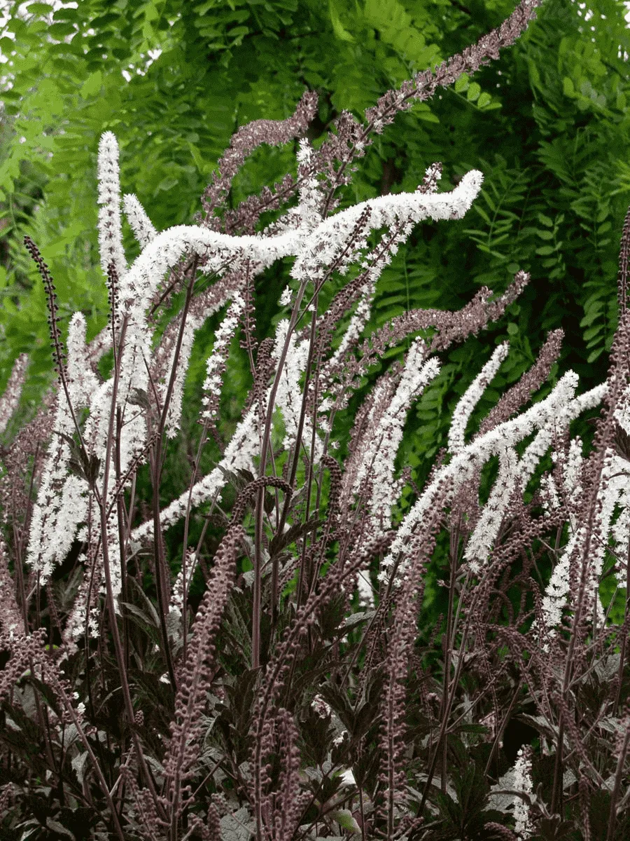 Клопогон ветвистый (Actaea racemosa), величественный представитель семейства лютиковых, поражает воображение своей утончённой красотой и строгим благородством облика. Высокий стройный стебель достигает порой полутора метров высоты, увенчанный пышной кистью белоснежных цветков, словно свеча, горящая среди лесной тени. Листья крупные, рассечённые на узкие сегменты, окрашены в насыщенный тёмно-зелёный оттенок, создавая контраст с нежностью соцветия. Цветки мелкие, многочисленные, собраны в длинные свисающие кисти, источают едва уловимый аромат, привлекающий насекомых-опылителей. Растёт преимущественно в тенистых лесах умеренного пояса Северной Америки, предпочитая влажную плодородную почву и прохладу густых зарослей. Этот загадочный обитатель лесных чащин обладает мощной корневой системой, способствующей долголетию и устойчивости к неблагоприятным условиям среды.