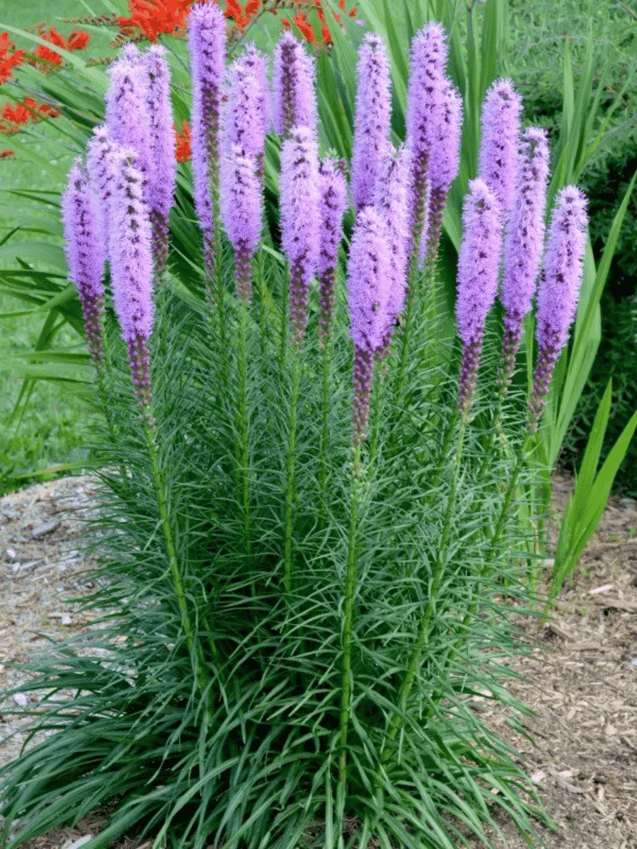 Лиатрис колосковый (Liatris spicata), пленяя взор своей утончённой красотой, представляет собой многолетнее травянистое растение семейства астровых, покорившее сердца садоводов изысканностью вертикальных соцветий. Его прямостоячие стебли достигают высоты от полуметра до метра, увенчанные густым колосовидным соцветием, состоящим из множества мелких пурпурных цветков, собранных в плотную кисть, словно нежная бархатная свеча, горящая среди зелёной листвы. Листья линейные, узколанцетные, ярко-зелёные, слегка шероховатые, расположены очередно вдоль всего стебля, создавая эффект грациозности и лёгкости. Цветёт лиатрис летом, радуя глаз продолжительным периодом цветения, когда каждый цветок раскрывается снизу вверх, постепенно превращаясь в живописную композицию, привлекающую внимание бабочек и пчёл. Растение предпочитает солнечные места, хорошо дренированные почвы и легко адаптируется к различным климатическим условиям, распространяясь преимущественно в Северной Америке, где оно стало символом природного очарования прерий и лугов.