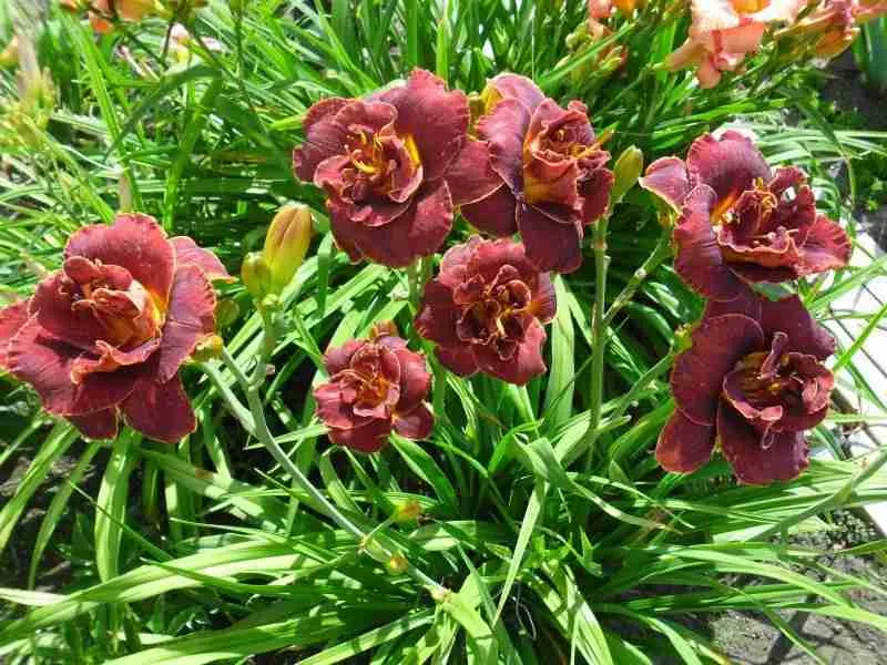 Лилейник *Burgundy Love* пленяет взор роскошной палитрой тёмно-вишнёвых оттенков, словно переливающихся бархатом благородства. Его широкие листья образуют пышную розетку, элегантно изгибаясь от основания мощного корневища, создавая живописный фон для эффектных цветков. Цветоносы устремляются вверх, достигая высоты около метра, увенчанные крупными бутонами, раскрывающимися один за другим в течение нескольких недель. Лепестки цветка имеют глубокую винно-красную окраску с едва уловимым пурпурным оттенком, плавно переходящим в золотистую сердцевину, украшенную тонкими штрихами контрастного цвета. Каждый цветок живёт всего сутки, однако благодаря последовательному распусканию бутонов растение сохраняет декоративность продолжительное время. Этот неприхотливый многолетник прекрасно адаптируется к различным условиям произрастания, радуя садоводов своей устойчивостью к болезням и засухе, превращая любой садовый уголок в изысканный уголок природы.