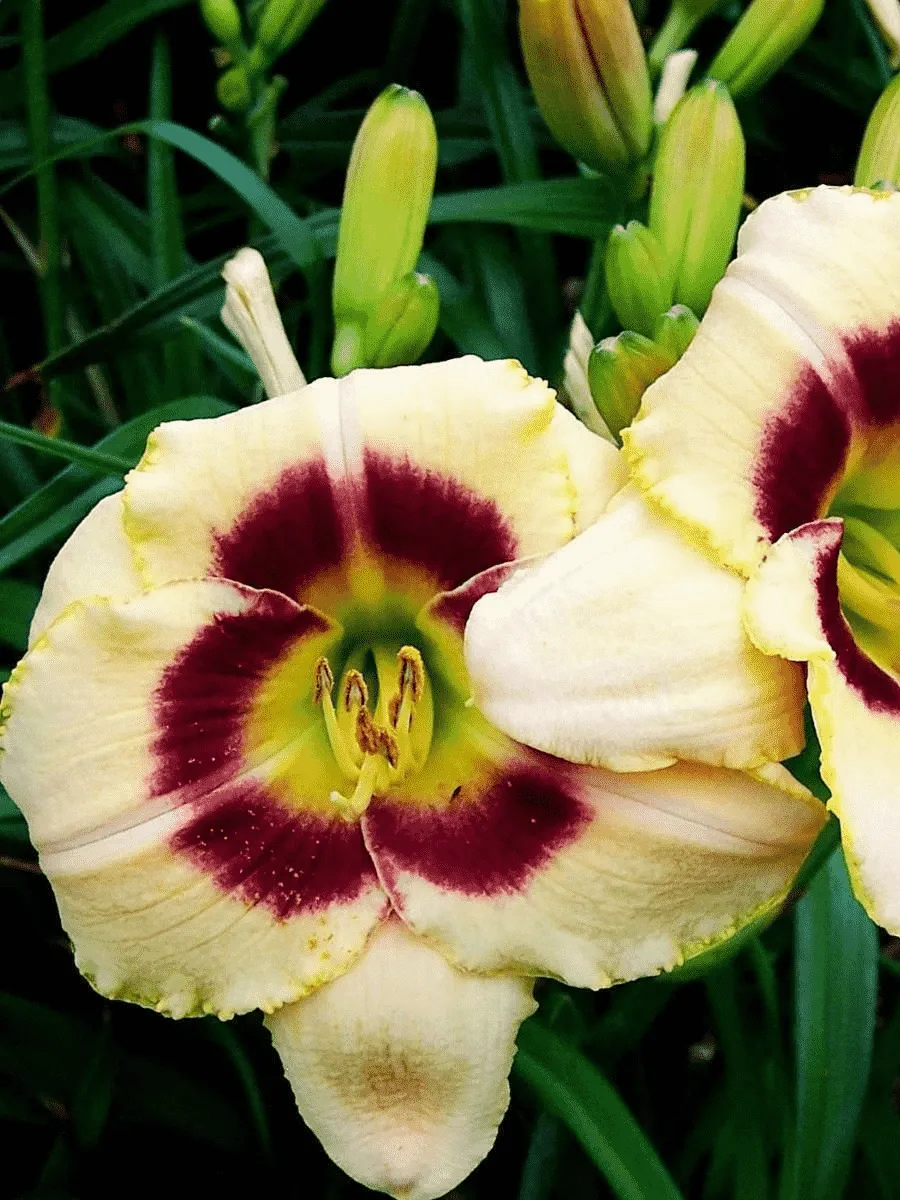 Лилейник *Custard Candy* пленяет взор нежностью кремово-жёлтых лепестков, украшенных тонкой розовато-абрикосной каймой и золотистым центром, словно солнечный лучик застыл среди зелени сада. Листья узколанцетные, длинные и слегка дугообразно изгибающиеся, образуют пышную зелёную массу, подчёркивая элегантность соцветий. Цветки крупные, диаметром около 15 см, распускаются один за другим на высоких прочных цветоносах высотой до метра, создавая эффект непрерывности цветения с июня по август. Растение неприхотливо, устойчиво к болезням и неблагоприятным условиям среды, прекрасно адаптируется к различным типам почв и освещённости, радуя садоводов своей декоративностью долгие годы.