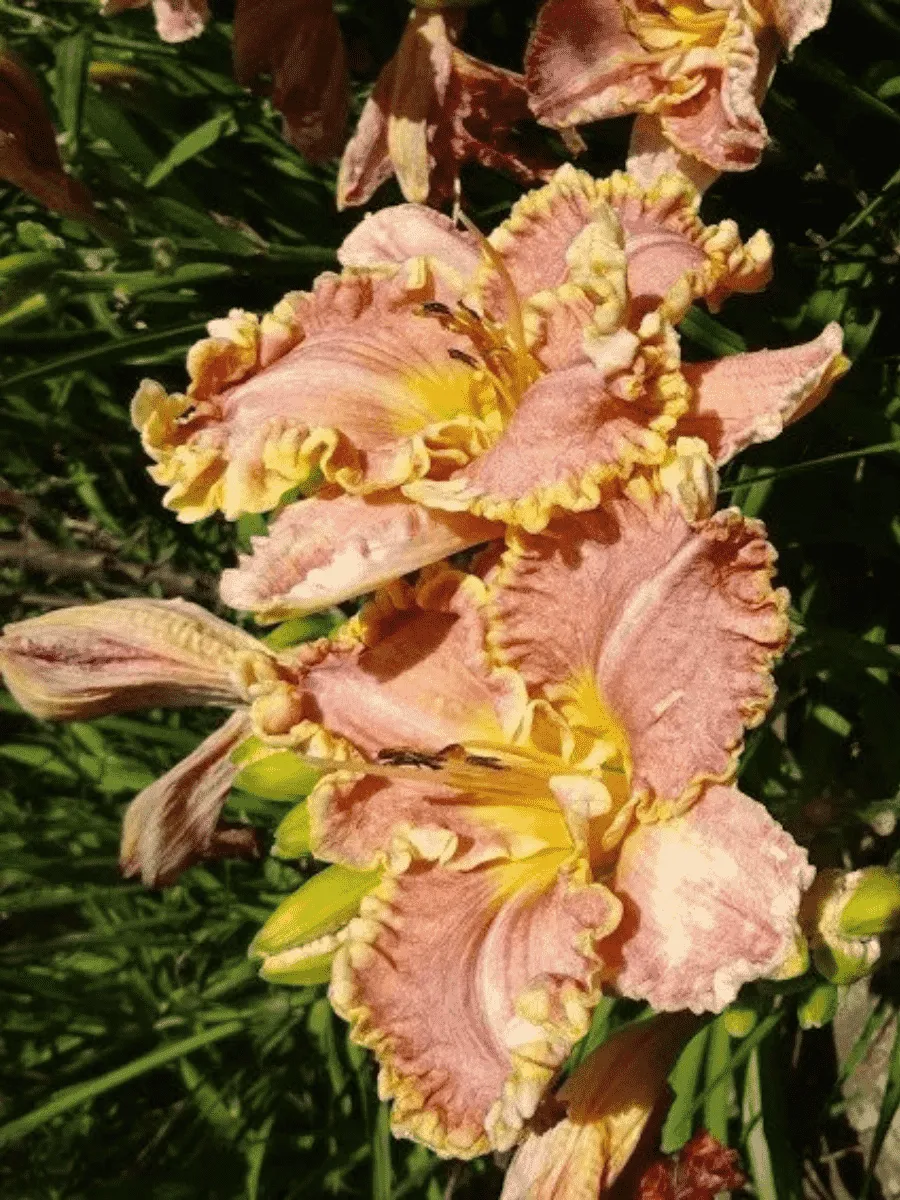 Лилейник *Darla Anita* пленяет взор изысканным сочетанием нежности и благородства форм. Его листья узколанцетные, слегка волнистые по краям, образуют пышную зелёную розетку высотой около полуметра, словно живописная живая рамка вокруг роскошной палитры цветов. Цветоносы возвышаются над листвой, достигая метра высоты, увенчанные крупными бутонами диаметром до 15 см. Лепестки цветка нежно-розовые, плавно переходящие от светлого центра к насыщенному краю, украшенные тонкими золотистыми прожилками, придающими особую утончённость и глубину оттенкам. Сердцевина цветка ярко-жёлтая, контрастирующая с лепестками и подчёркивающая элегантность композиции. Период цветения продолжительный, растение радует глаз яркими красками с июня по август, постепенно раскрываясь новыми цветами каждый день. Предпочитает солнечные места, хорошо растёт на плодородных почвах, устойчиво к засухе и морозу, легко размножается корневищем и прекрасно адаптируется к различным условиям выращивания, становясь украшением садов и парков.