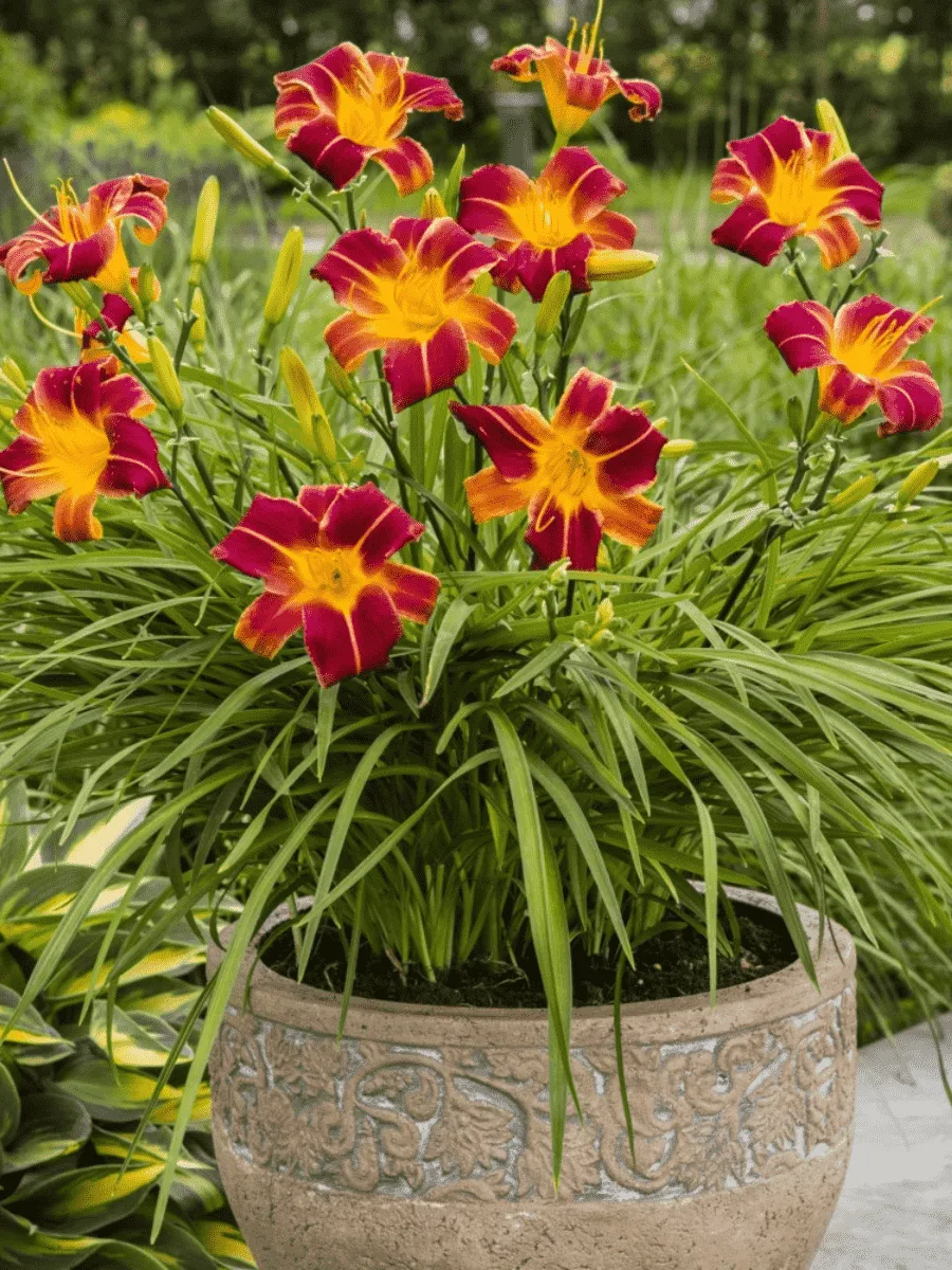 Лилейник EveryDaylily Red Rib очаровывает своей элегантностью и утончённостью форм. Листья длинные, узколанцетные, ярко-зелёные, слегка волнистые по краям, образуют пышную прикорневую розетку, придающую растению благородство и строгость облика. Цветоносы высокие, стройные, поднимаются над листвой, увенчанные крупными цветами диаметром около 15 см. Лепестки цветка насыщенно-красные, бархатистые, с тонкой белой каймой по краю, создавая эффект переливающейся ткани. Сердцевина цветка украшена контрастной жёлтой полосой, проходящей вдоль каждого лепестка, словно золотистая нить, подчёркивающая изысканность композиции. Период цветения продолжительный, растение радует глаз яркими красками с июня до августа, постепенно раскрывая новые бутоны каждый день. Предпочитает солнечные места, хорошо растёт на плодородных почвах, устойчиво к болезням и неприхотливо в уходе, легко размножается делением корневища. Этот сорт станет украшением любого сада, привнося в ландшафт нотки роскоши и гармонии природы.