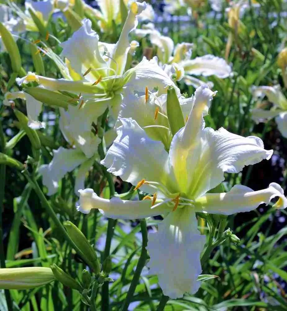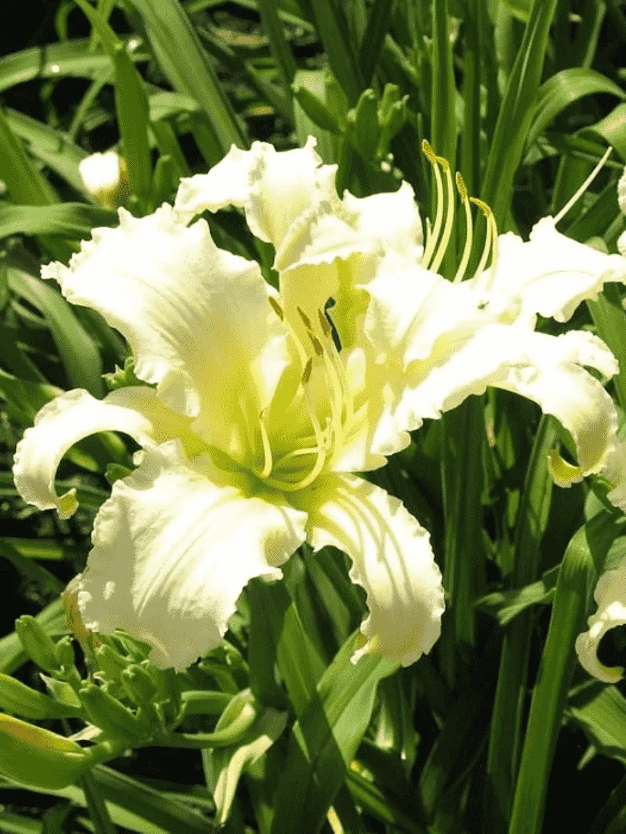 Лилейник *Heavenly Angel Ice* пленяет взор нежностью белоснежных лепестков, словно сотканных из утренней дымки и украшенных едва заметной серебристо-голубоватой каймой, придающей цветкам особую воздушность и утончённость. Листья узколанцетные, ярко-зелёные, слегка волнистые по краям, образуют пышную прикорневую розетку, подчёркивая элегантность соцветий. Цветоносы высокие, стройные, несут крупные цветки диаметром до 15 см, раскрывающиеся один за другим, создавая эффект продолжительного цветения с июня по август. Растение неприхотливо, устойчиво к болезням и неблагоприятным условиям среды, прекрасно адаптируется к различным типам почв и освещённости, становясь украшением садов и парков, где царит гармония природы и искусства.