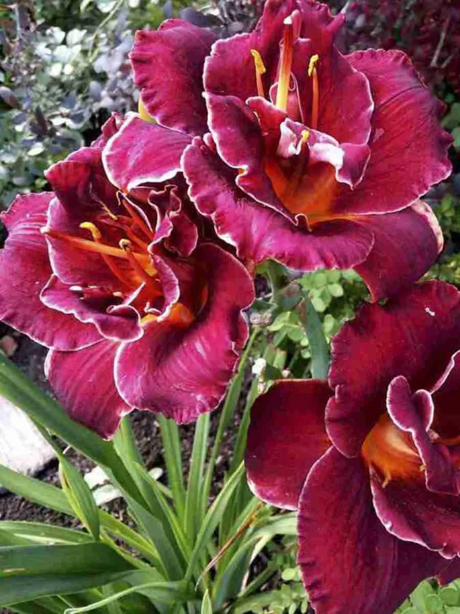 Лилейник *Night Embers* пленяет взор роскошной тёмно-красной палитрой цветков, словно искры пламени, мерцающие среди зелени сада. Его широкие ремневидные листья образуют плотную розетку, создавая живописный фон для эффектных соцветий. Цветки крупные, диаметром около 15 см, распускаются один за другим на высоких прочных цветоносах высотой до метра, украшая сад продолжительное время с июля по август. Лепестки бархатистые, насыщенно-бордовые с едва уловимым пурпурным отливом, контрастируют с золотистым горлом цветка, придавая особую глубину и изысканность общему облику. Растение неприхотливо, устойчиво к болезням и неблагоприятным условиям среды, прекрасно размножается делением корневищ и быстро формирует густые куртины, становясь украшением любого уголка сада.