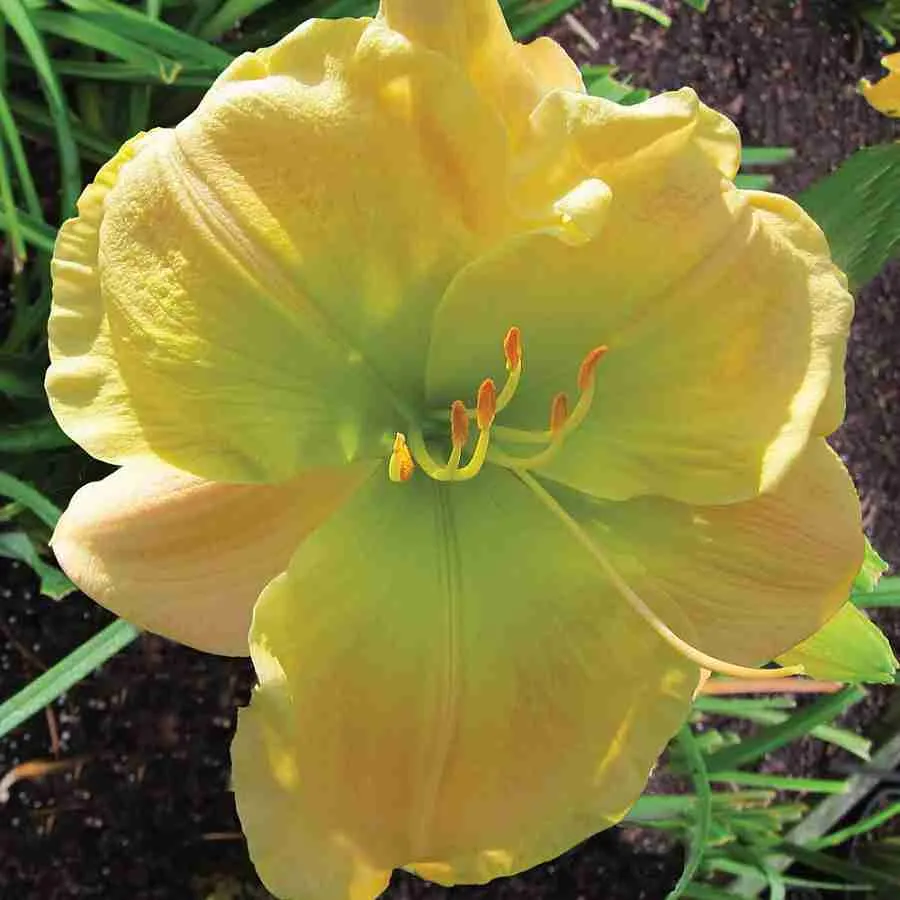 Лилейник *Tequila and Lime* пленяет взор изысканным сочетанием нежной зелени и ярких цветов, словно воплощением солнечного лета. Его листья узколанцетные, слегка волнистые по краям, образуют пышную розетку высотой около полуметра, создавая живописный фон для роскошных цветков. Цветоносы возвышаются над листвой, увенчанные крупными бутонами, раскрывающимися в полдень и источающими тонкий аромат. Лепестки цветка окрашены в насыщенный лимонно-жёлтый оттенок с золотистым отливом, плавно переходящим в зеленовато-лимонную кайму по краю лепестков, отчего растение кажется сияющим солнечным лучиком среди зелёного ковра сада. Период цветения длится долго, радуя глаз яркими красками всё лето до осени. Растёт быстро, легко размножается делением корневища, прекрасно адаптируется к различным условиям произрастания, предпочитая солнечные места и плодородные почвы.