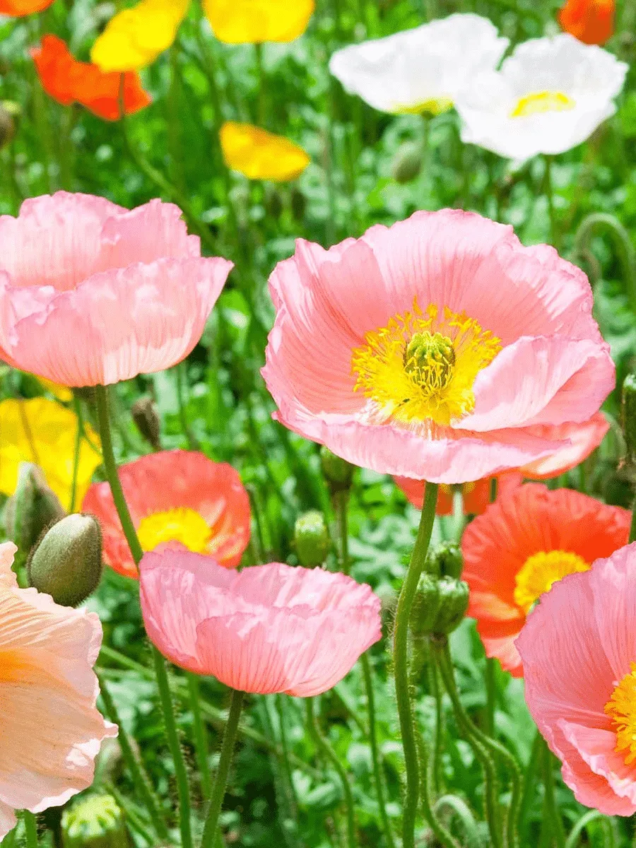 Мак голостебельный сорта *Chambagne Bubbles Mix* пленяет взор нежностью лепестков, переливающихся оттенками от нежно-кремового до золотисто-абрикосового цвета, словно пузырьки шампанского играют солнечными лучами среди зелени садов. Стройные стебли высотой около полуметра несут крупные цветки диаметром до десяти сантиметров, раскрывающиеся утром и закрывающиеся вечером, создавая иллюзию мимолетности и хрупкости жизни. Листья рассечённые, серо-зелёные, покрыты лёгким пушком, контрастируя с яркими цветами бутонов и подчёркивая воздушность облика растения. Цветёт обильно и продолжительно, начиная с конца весны и заканчивая летом, украшая клумбы, миксбордеры и альпийские горки своей изысканной простотой и утончённой красотой.