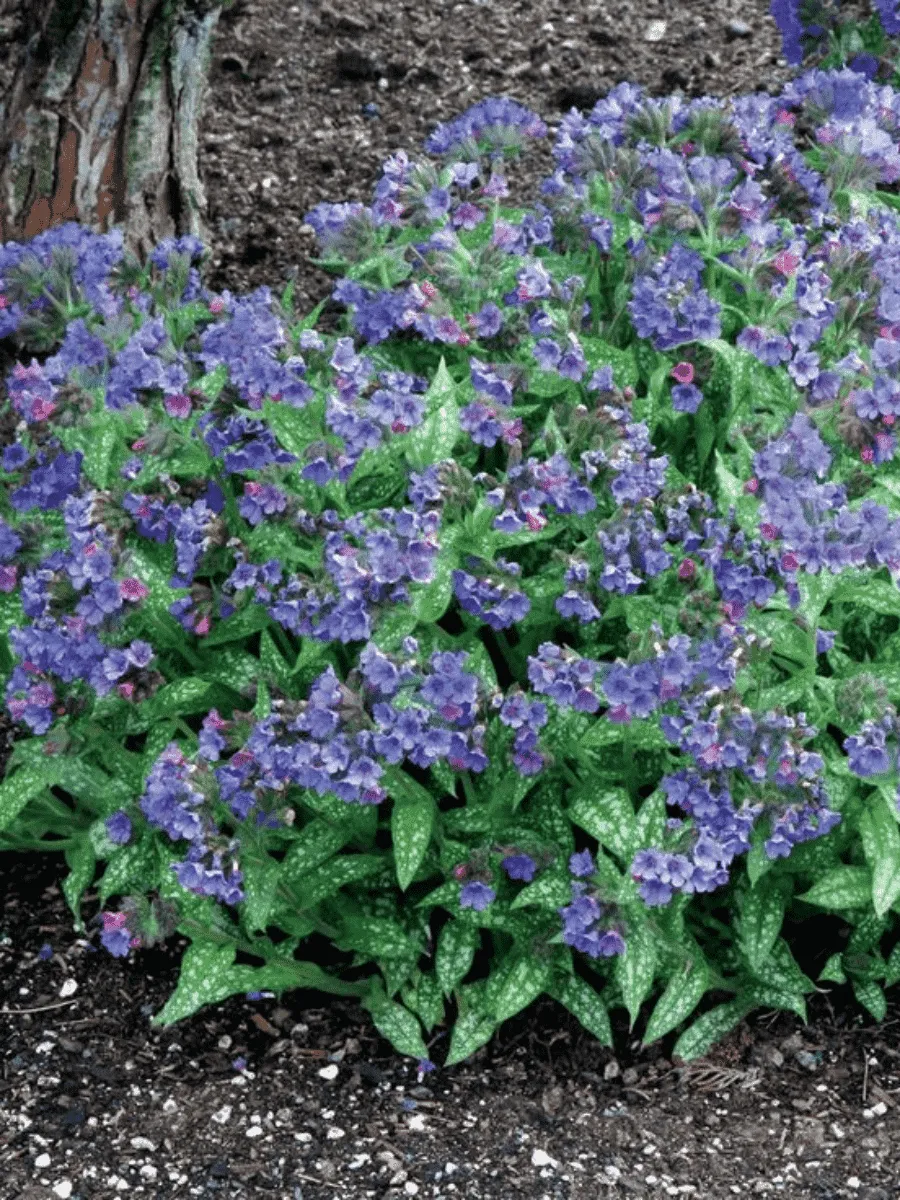 Медуница гибридная сорта *Trevi Fountain* пленяет взор нежностью своего облика и утончённостью форм. Это компактное травянистое растение высотой около 15–25 см отличается изысканностью серебристо-зелёной листвы, украшенной живописными пятнами кремово-белого цвета, словно лёгкий росчерк кисти художника. Листья сердцевидной формы слегка волнистые по краям, бархатистые на ощупь, создают впечатление мягкого кружева, переливающегося в лучах солнца. Цветки медуницы раскрываются ранней весной, когда ещё царит прохладная свежесть, формируя небольшие кистевидные соцветия нежно-розового оттенка, постепенно переходящего в насыщенный фиолетовый тон. Изящность цветков подчёркивается тонким ароматом, привлекающим первых насекомых-опылителей после зимней спячки. Растёт медленно, предпочитая полутень и умеренно влажную почву, легко адаптируясь к различным условиям сада, создавая очаровательные островки красоты среди тенистых уголков.
