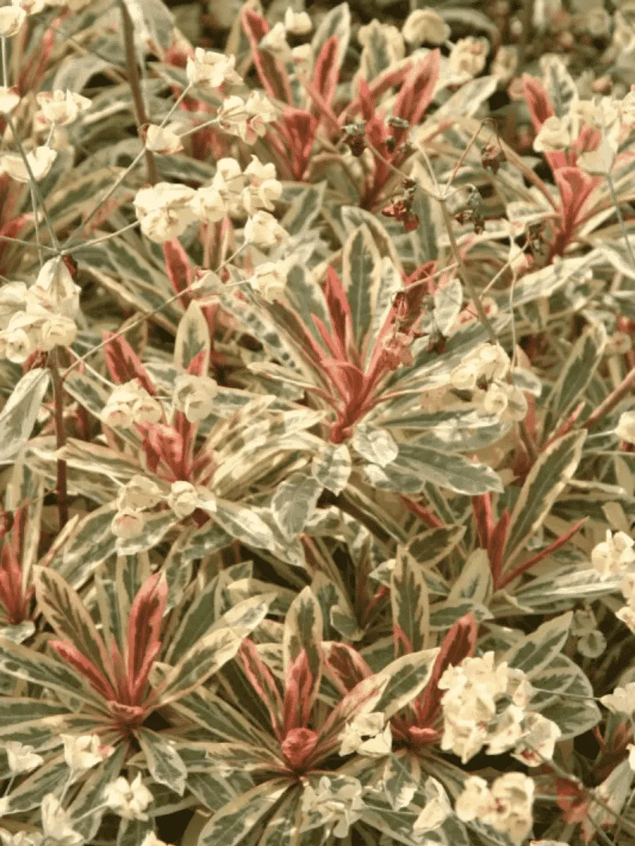 Молочай миндалевидный сорта *Frosted Flame* представляет собой эффектную суккулентную розетку высотой до полуметра, состоящую из мясистых, слегка ребристых стеблей, покрытых крупными листьями оригинальной формы. Листья миндалевидные, плотные, кожистые, словно вырезанные искусной рукой мастера, украшены серебристо-белым мраморным узором поверх глубокого зелёного фона, который особенно ярко проявляется весной и летом. По мере взросления листья приобретают нежный оттенок слоновой кости, создавая впечатление старинного фарфора, покрытого тонким слоем патины. Цветёт растение редко, мелкими жёлтыми цветами, собранными в небольшие зонтики, однако главная прелесть молочайного куста заключается именно в роскоши листвы, способной украсить любой интерьер или садовый уголок своей экзотической красотой и благородством форм.