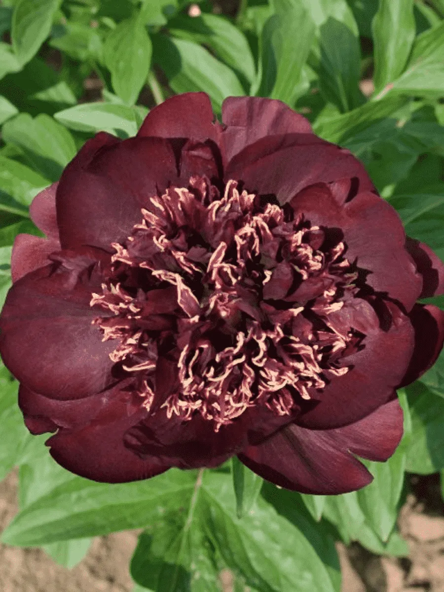 Пион гибридный *Chocolate Soldier* пленяет взор роскошной тёмно-красной палитрой лепестков, словно покрытых тонким слоем шоколада, оттенённых бархатистым пурпуром и глубоким винным цветом. Его крупные цветки диаметром до 18 см распускаются поздней весной—ранним летом, источая тонкий аромат, привлекающий внимание насекомых-опылителей. Листья рассечённые, глубоко разрезанные, насыщенно-зелёные, слегка блестящие, придают растению элегантность и благородство облика. Куст компактный, высотой около метра, густо облиственный, формирует плотную крону, идеально подходящую для одиночных посадок и групповых композиций. Растёт медленно, устойчив к болезням и неблагоприятным условиям среды, предпочитает солнечные места и плодородные почвы, демонстрируя свою неприхотливость и долговечность. Этот сорт станет украшением любого сада, привнося атмосферу изысканности и утончённости.
