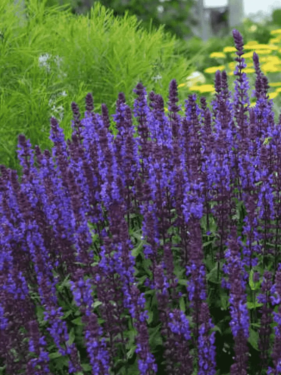 Шалфей дубравный *New Dimension Blue* пленяет взор своей утончённой красотой и благородством форм. Это многолетнее травянистое растение достигает высоты около полуметра, формируя компактную кустистую крону с прямостоячими стеблями, покрытыми нежной пушистой опушкой. Листья шалфея крупные, сердцевидные, слегка морщинистые, насыщенно-зелёного цвета с серебристым отливом, словно покрыты тонким слоем утренней росы. Цветёт обильно и продолжительно, начиная с конца весны до середины лета, раскрывая многочисленные соцветия-колосья, состоящие из множества мелких цветков небесно-голубого оттенка, будто отражающих ясность летнего неба. Растение предпочитает солнечные места, хорошо дренированные почвы и умеренный полив, легко адаптируясь к различным условиям произрастания и украшая собой сады, парки и альпийские горки своим изысканным обликом и чарующим ароматом.