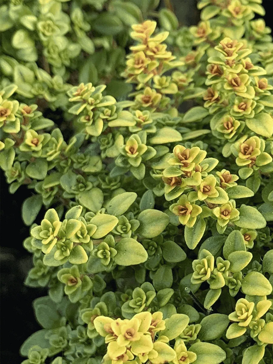 Тимьян блошиный сорта *Archers Gold* — миниатюрная ароматическая травка, покоряющая сердца садоводов своей нежностью и изысканностью. Это компактное растение высотой всего около десяти сантиметров образует плотную пушистую подушку из мелких золотисто-жёлтых листочков, словно сотканных из солнечных лучей. Листья мелкие, овальные, слегка зазубренные по краям, источают тонкий пряный запах, усиливающийся от прикосновения. Цветёт тимьян мелкими розово-лиловыми цветами, собранными в небольшие головки, украшая собой садовый пейзаж с июня до сентября. Растение предпочитает солнечные места, хорошо дренированные почвы и легко переносит засуху благодаря мощной корневой системе. Благодаря своему декоративному виду и неприхотливости тимьян блошиный широко используется в альпинариях, рокариях и бордюрах, создавая живописные композиции и добавляя саду очарование природы.