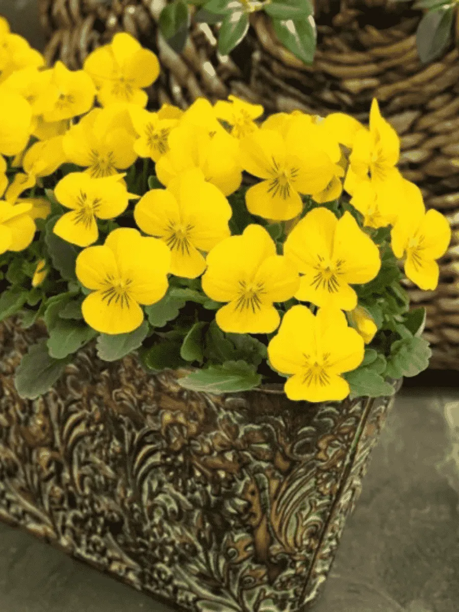 Виола рогатая Yellow Perfection — очаровательное травянистое растение с компактной формой куста и нежнейшими светло-зелёными листьями сердцевидной формы, слегка волнистыми по краям и покрытыми тонким пушком, придающим листьям бархатистый блеск. Цветки крупные, диаметром около пяти сантиметров, ярко-жёлтые, словно солнечные лучи, сияют среди зелени листвы, привлекая внимание своей изысканной красотой. Лепестки цветка гладко очерчены, верхний лепесток украшен едва заметными тёмными штрихами, добавляющими утончённости общему облику. Короткий стебель покрыт мелкими ворсинками, создавая впечатление мягкости и воздушности. Растёт кустик медленно, формируя аккуратную розетку высотой до двадцати сантиметров, идеально подходящую для бордюров, альпинариев и контейнерного озеленения. Предпочитает умеренно влажные почвы и полутень, легко адаптируется к различным условиям выращивания, радуя садоводов своим продолжительным цветением с весны до осени.