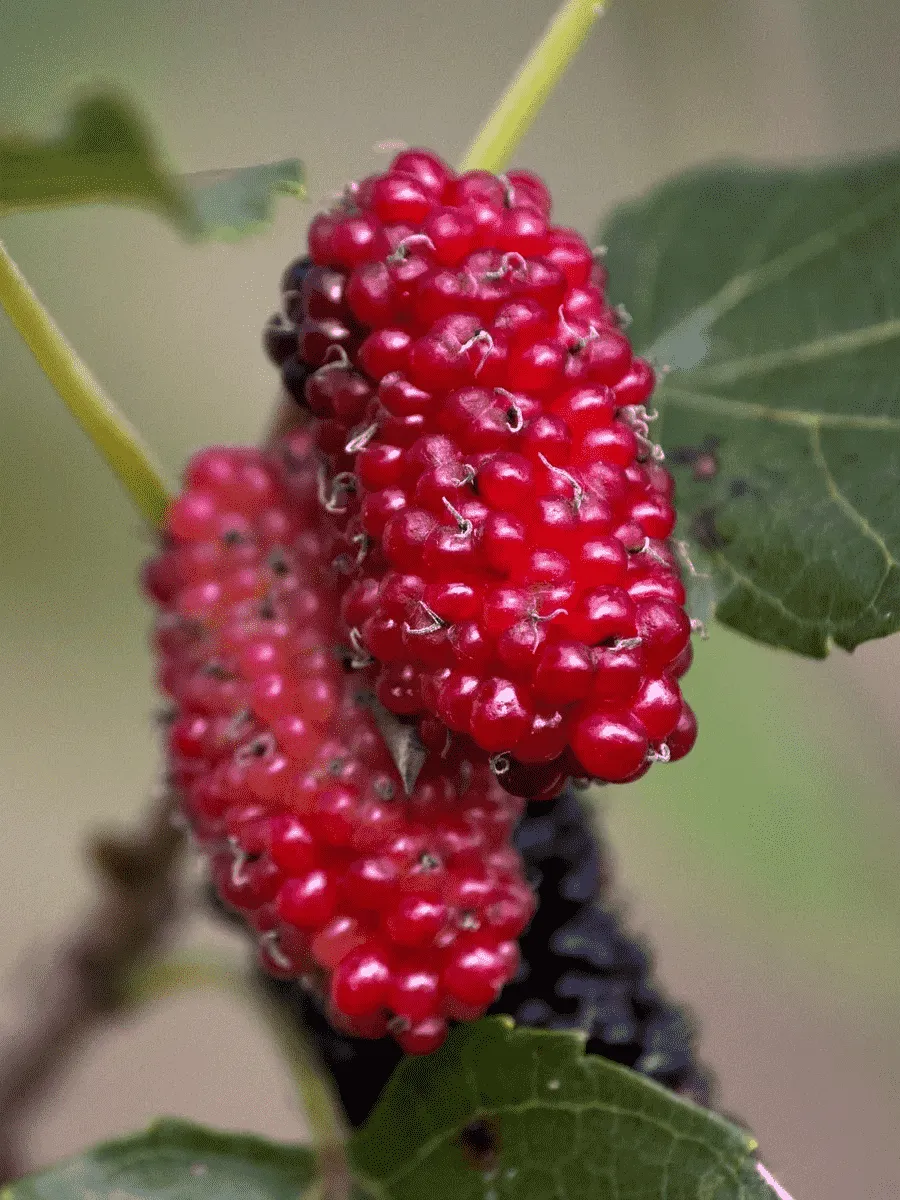 Шелковица чёрная сорта *Red №2* представляет собой величественное дерево с раскидистой кроной и мощной корневой системой, достигающее высоты до десяти метров. Листья крупные, сердцевидные, слегка шероховатые, насыщенно-зелёного цвета, украшенные чётко выраженными жилками, придающими особую декоративность растению. Цветёт шелковица мелкими невзрачными цветами, собранными в соцветия-колоски, едва заметные среди густой листвы. Растение отличается быстрым ростом, неприхотливостью и устойчивостью к неблагоприятным условиям среды, легко адаптируясь даже в городских условиях. Особенно эффектна шелковица осенью, когда её листья приобретают яркие оттенки жёлтого и оранжевого цветов, создавая живописную картину осеннего сада.