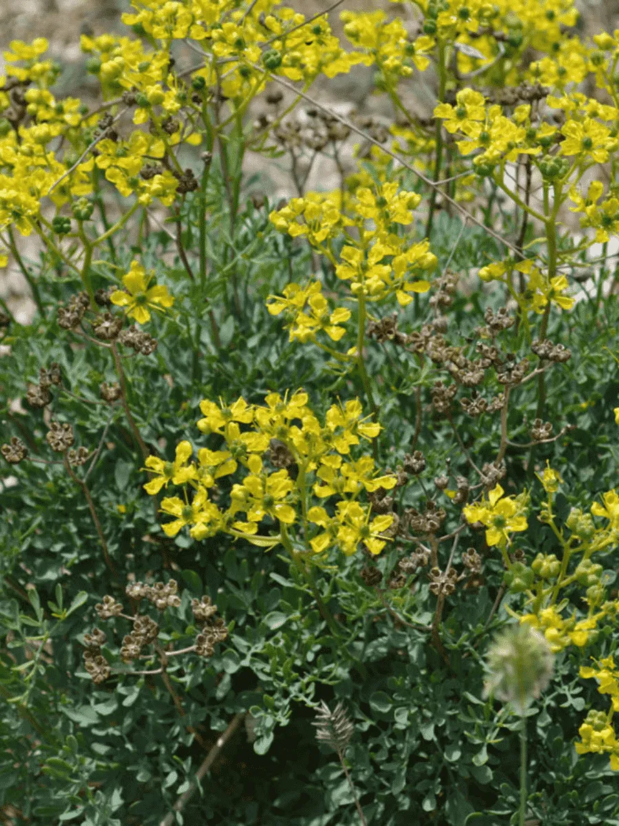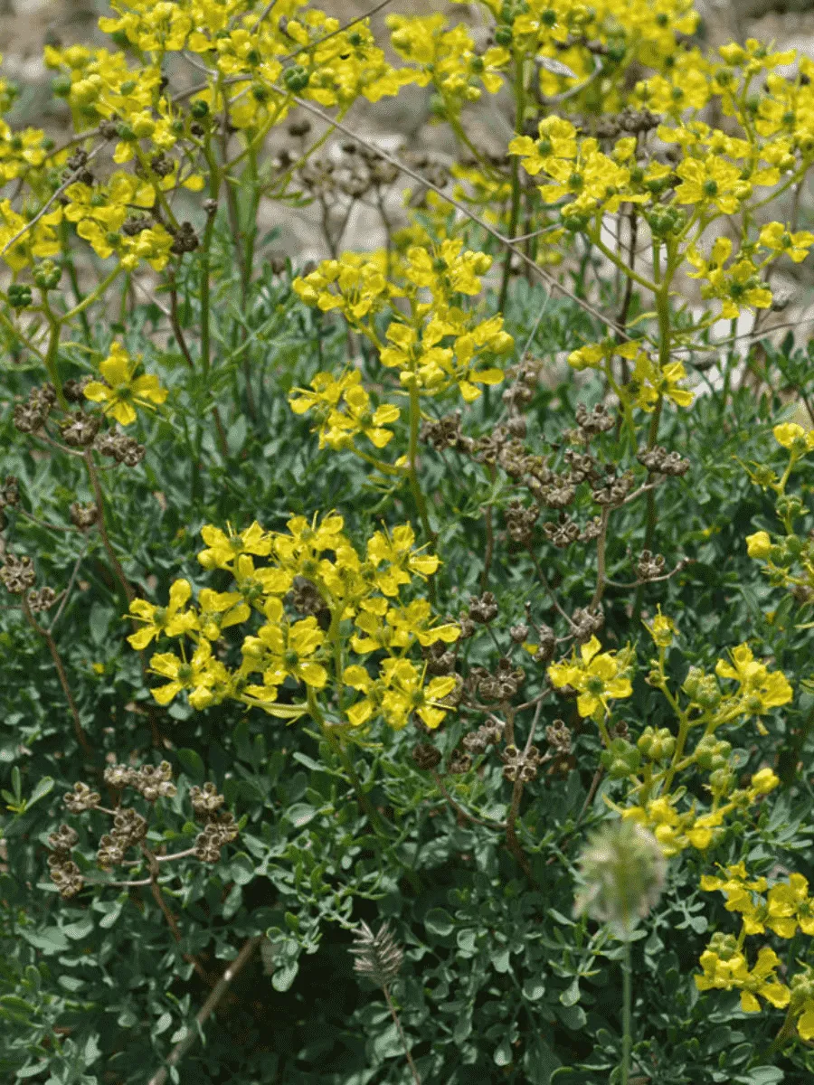 Рута душистая (Ruta graveolens), многолетнее травянистое растение семейства рутовых, пленяет взор своей строгой красотой и тонким ароматом эфирных масел. Стебель прямой, ветвистый, покрытый сизым восковым налетом, придающим растению благородную матовую дымку. Листья перисто-рассеченные, плотные, темно-зеленые сверху и серовато-сизые снизу, словно бархатная ткань, слегка блестящая от солнца. Цветки мелкие, золотисто-желтые, собраны в рыхлые зонтики, распускаются постепенно, создавая впечатление нежной солнечной россыпи среди зелени. Растёт медленно, предпочитая сухие каменистые почвы и солнечные места, распространена преимущественно в Средиземноморье, Крыму и Кавказе, где её аромат наполняет воздух теплом и пряностью южных дней.