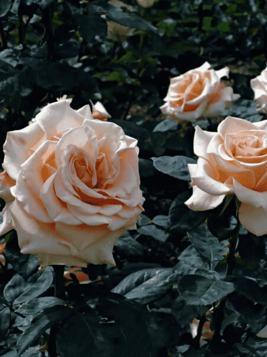 Роза чайно-гибридная *Marilyn Monroe* пленяет взор изысканным сочетанием нежности и благородства форм. Её крупные бутоны раскрываются пышными цветами диаметром около 15 см, демонстрируя роскошную палитру оттенков от кремово-белого до нежно-розового с едва уловимым золотистым отблеском. Лепестки бархатистые, слегка волнистые, образуют элегантную чашевидную форму, постепенно распускаясь в полумахровое великолепие. Листья тёмно-зелёные, блестящие, плотные, придают растению ухоженный и презентабельный облик. Куст компактный, высотой примерно 80–100 см, отличается крепкими побегами и устойчивостью к неблагоприятным условиям среды. Цветёт обильно и продолжительно, начиная с июня и вплоть до первых заморозков, наполняя сад тонким ароматом и очарованием истинной аристократичности.