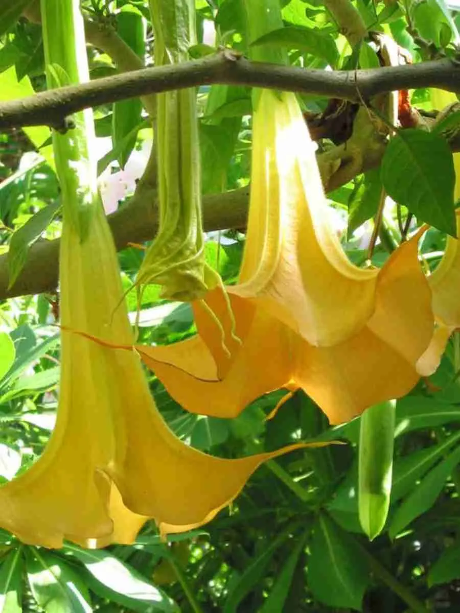 Бругмансия *geel* пленяет взор роскошью своего облика и изысканностью форм. Это вечнозелёное дерево средней высоты, достигающее трёх-пяти метров, обладает раскидистой кроной и стройным стволом, покрытым гладкой сероватой корой. Листья крупные, овально-продолговатые, слегка волнистые по краям, насыщенно-зелёной окраски, бархатистые на ощупь благодаря тонкому пушистому покрову. Цветки поражают воображение своей величиной и красотой: огромные трубчатые бутоны длиной до двадцати сантиметров раскрываются в элегантные чашевидные цветы золотисто-жёлтого цвета, источающие тонкий аромат ванили и цитрусовых. Они свисают гроздьями, словно золотые фонарики, украшая растение весь тёплый сезон. Родина бругмансии — тропики Южной Америки, где она предпочитает влажные леса и плодородные почвы, однако успешно культивируется и в умеренных широтах, радуя садоводов своим экзотическим великолепием.